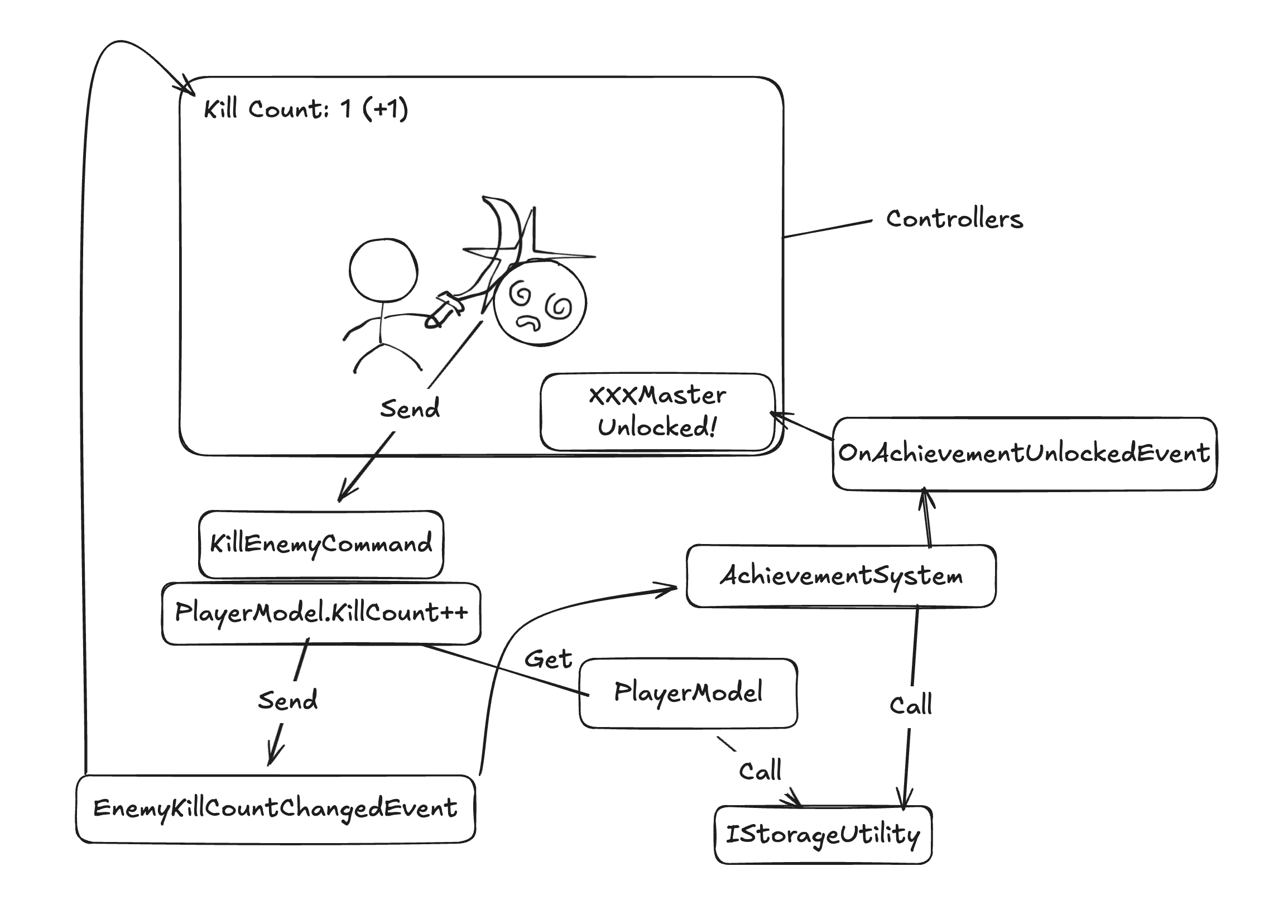 - Presentation Layer:ViewController Layer. Using IController interface,recive input from user and state changed event from model. In unity MonoBehaviour is on presentation layer